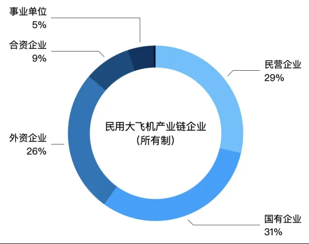国营、民营、外资各占约1/3,而其中民营企业相对较少,这与航空产业链总体供应商民企占比过半形成鲜明对比。航空产业网分析,成为大飞机产业链的认证供应商具有较高的门槛,中国本土民营企业的发展尚有较大的潜力和空间。