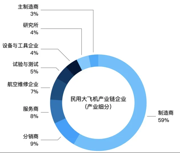 从企业所处的产业链细分看,主制造商占比3%、制造商(包括机体结构件、机载系统与设备、航空材料等)占比59%;其次是分销商(占比9%),专业服务商(占比8%)和航空维修企业(占比7%),产业链周边企业如试验与测试、设备与工具企业分别占比5%、4%。