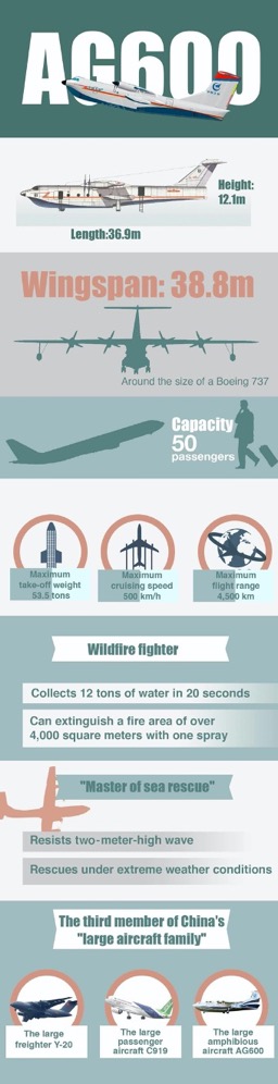 Codenamed Kunlong, AG600 is the world's largest amphibious plane, and the first large specialist civil aircraft independently developed by China to meet the needs of emergency rescue and natural disaster prevention and control efforts.