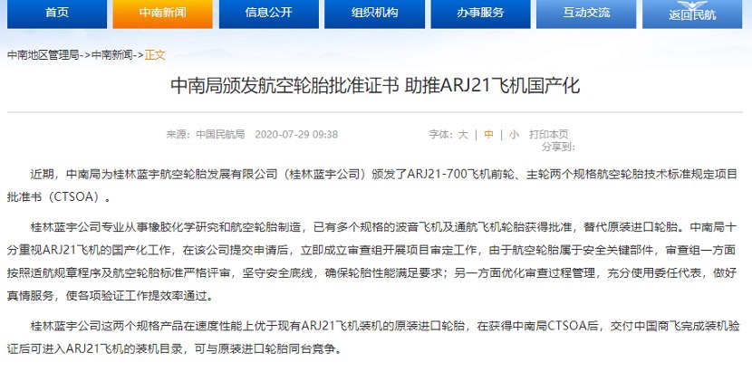 Recently, CAAC Central and Southern Regional Administration issued CTSOA to Guilin Lanyu Aviation Tire Development Co., LTD. (Guilin Lanyu Company) of aviation tires of two specifications for ARJ21-700 aircraft front wheel and main wheel.