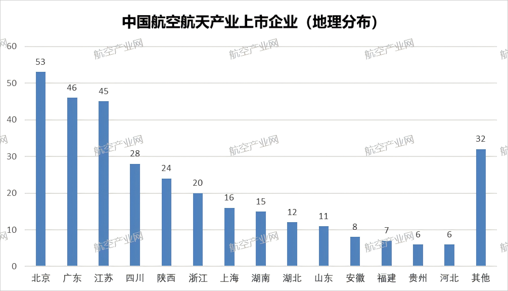 从企业的地理分布看,北京市、广东省、江苏省、四川省与陕西省位列前五名,均有20家及以上的航空航天产业链上市公司。