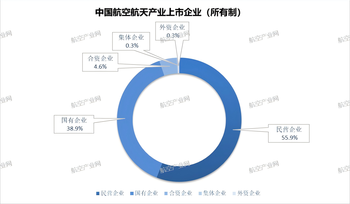 从企业所有制类别来看,根据航空产业网统计,民营企业占比近56%,国有企业占比近39%。合资企业、集体企业及外资企业等其他企业类型占比约5%。与2023年相比,2024年航空航天产业上市企业中民营企业占比进一步提升,由2023年的53%提升至2024年的55.9%。 民营企业占比进一步提升,主要得益于政策支持力度加大、市场环境优化及产业链协同发展。民营企业灵活的经营机制和创新能力,能够快速响应市场需求,抓住市场机遇。民营企业占比最多的细分产业类型为机载系统与设备制造与技术服务,国有企业占比最多的细分产业类型为航空航天材料制造和航空标准件制造,以及航天及军工相关产业。