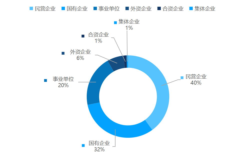 从企业的所有制类别看,民营企业占比超越国有企业,达到40%;国有企业占比32%;事业单位位列第三,占比20%。