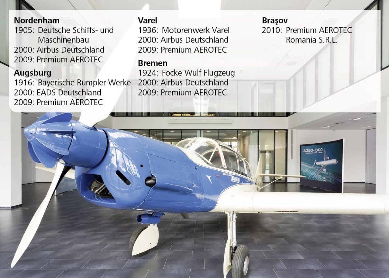 在2008年9月,与Stelia(前身为空客的Aerolia 合并Sogerma)类似,空客在诺登汉姆和瓦雷尔的工厂以及前EADS在奥格斯堡的工厂在德国组成了新的公司Premium AEROTEC GmbH,一年后,空客在不来梅的零部件生产部门也被PAG收购。2010年12月,PAG还接管了从事军事项目的ASL(Aircraft Services Lemwerder)。2011年,PAG在罗马尼亚的布拉索夫建立新的工厂,这也是PAG第一个位于德国境外的工厂。