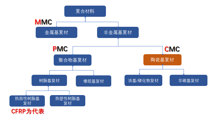 复合材料可根据基材的不同分为三类:聚合物基复合材料(Polymer Matrix Composite,PMC),金属基复合材料(Metal Matrix Composite, MMC)与本篇主要介绍的陶瓷基复合材料(Ceramic Matrix Composite,CMC)。其中,PMC的应用在航空航天中占据主导地位,以至于现在人们提起复合材料,就会联想到热固性塑料和CFRP(碳纤维强化聚合物基复材)等名词。