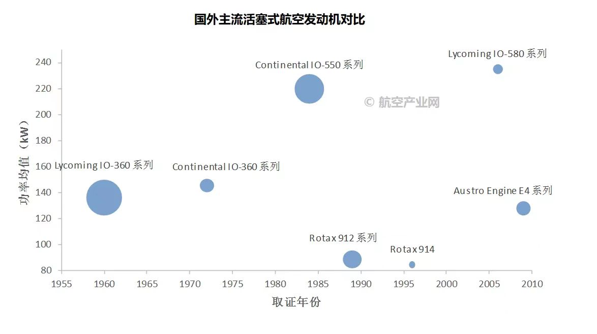 针对各类主流中小型航空发动机,以取证年份、推力或功率、推重比等数据结合近年产量,呈现了主流发动机型号概况。下图是活塞式发动机的样例。详细分析与数据请见报告正文。