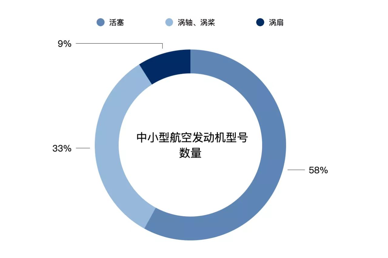 从中小型发动机类型看,型号数量占比最大的是活塞发动机(占比约58%),其次涡轴、涡桨发动机(占比约33%),涡扇发动机占比最少(占比约9%)。