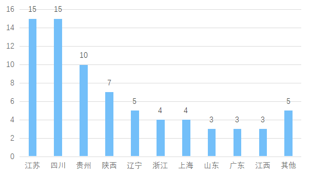从两机项目地理分布情况来看,数量较多的是江苏省和四川省,各有15个相关项目,其次是贵州省有10个相关项目,陕西省有7个相关项目。