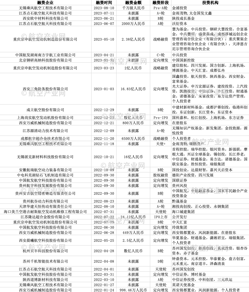 部分发动机产业链企业重点融资情况 © 航空产业网