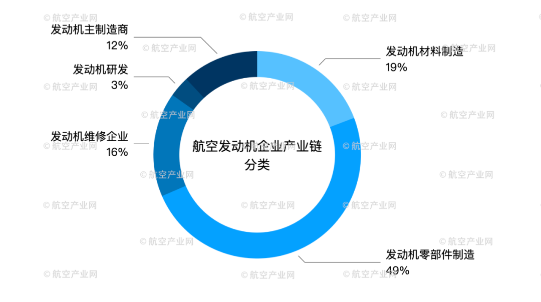 从产业链上下游来看,发动机研发和主制造商占比共 15%;发动机零部件制造占比 49%;材料制造企业占比 19%;发动机维修企业占比为 16%。