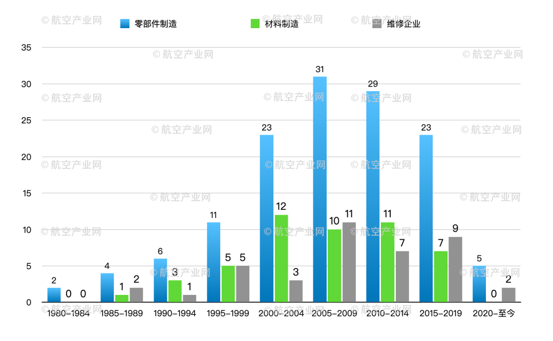 从发动机产业链企业成立时间来看,零部件制造企业、材料制造企业、发动机维修企业在2000年至2010年有比较明显增长。这与我国航空制造与航空运营在这期间的高速成长密不可分。