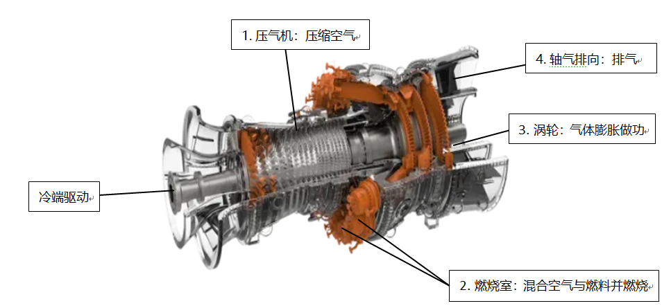燃气轮机的工作原理基于布雷顿循环。,这是一种热力学循环,涉及四个主要过程:压缩加热、膨胀和冷却,燃气轮机典型结构和运行逻辑如下图所示(详细解释见完整报告)。