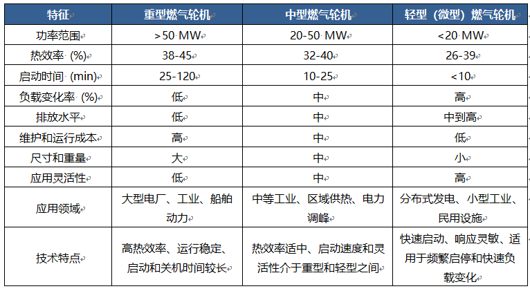 (2) 轻、中、重型燃气轮机 根据燃气轮机的结构及输出功率,燃气轮机可以分为微型、轻型、中型、和重型燃气轮机。下表展示了以上三种燃气轮机的主要区别: