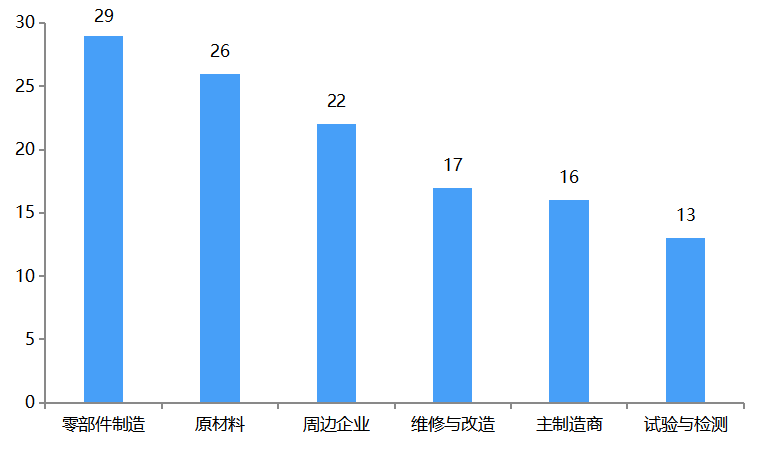 二、燃气轮机产业链 据航空产业网统计,中国燃气轮机全产业链企业总数量已超300家。航空产业网筛选出其中主要企业百余家(主营业务聚焦燃气轮机产业链的规模企业或细分领域重点企业),如下图所示,其中零部件研发与制造企业数量最多,为29家;其次为原材料研发与生产企业,企业数量为26家;产业链周边企业数量为22家,维修与改造企业17家,主制造商16家,试制与检测企业13家。