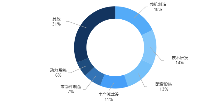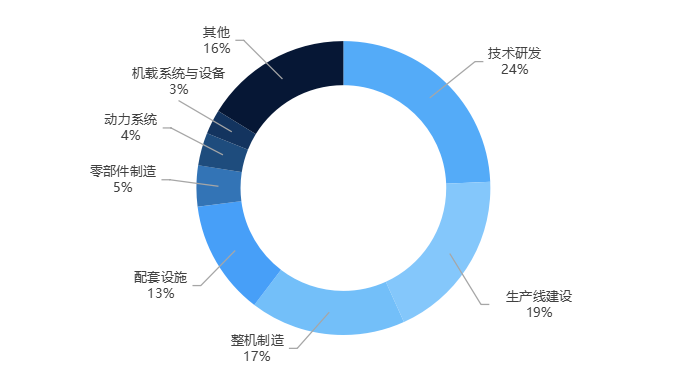 在全国范围内的低空相关项目中,生产线建设类项目数量较多,有171个,占比约18%;其次是配套设施类项目有168个,占比约17%。