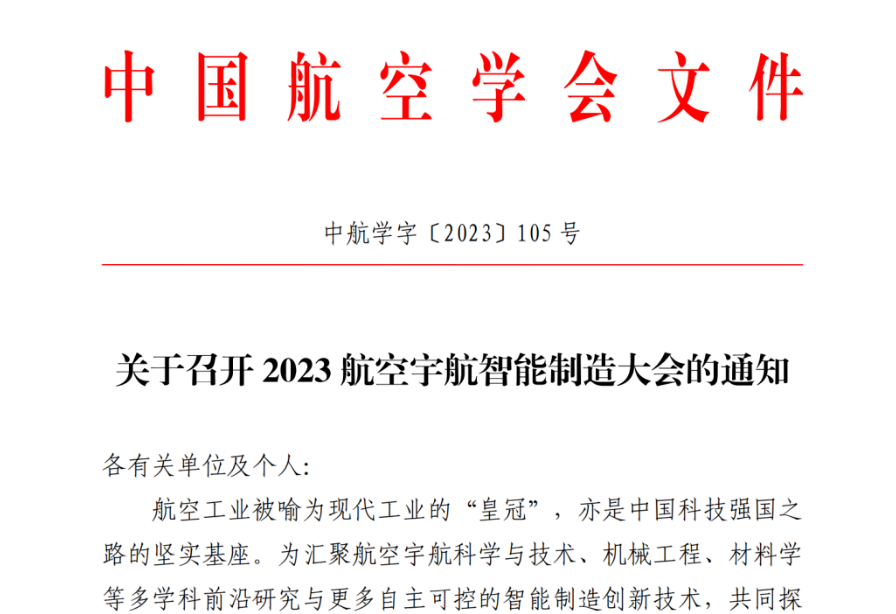 中国航空学会与北京航空航天大学定于11月10日在京联合主办“2023航空宇航智能制造大会”,本次大会将以《“智”造新动能》为主题。