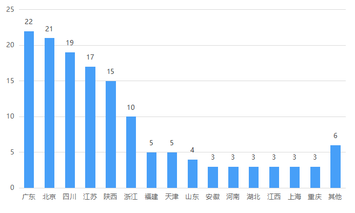 从地理位置分布上看,广东、北京、四川的大型民用无人机制造企业数量位列前三,均在20家左右;江苏和陕西紧跟其后,达15家及以上。