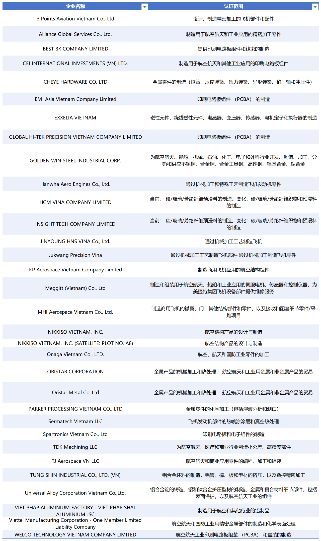 据航空产业网统计,越南当前有超30家企业取得AS9100认证。在越南取得AS9100认证的企业中,超60%的企业认证范围为精密加工与零件制造、电子组件与PCB制造。