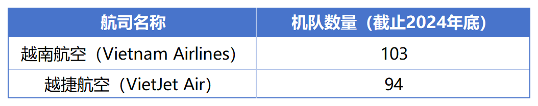 从机队数量来看,截至2024年12月中下旬,越南民航注册飞机总数为249架,含220架固定翼客机及29架直升机,较上年减少12架,且33架因发动机故障长期停运。据航空产业网统计,其中,越南航空和越捷航空的机队总数达197架,占比近80%。