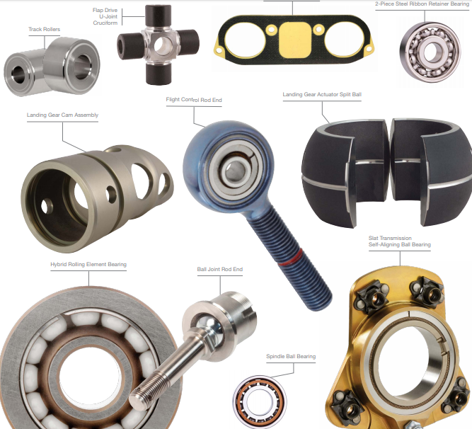 图为Kaman的航空轴承及相关产品,其中有起落架凸轮总成、2件式钢带止动轴承、起落架执行器分离球、混合滚动轴承等